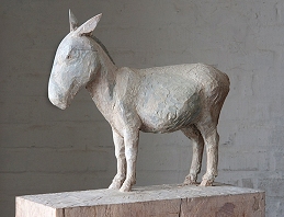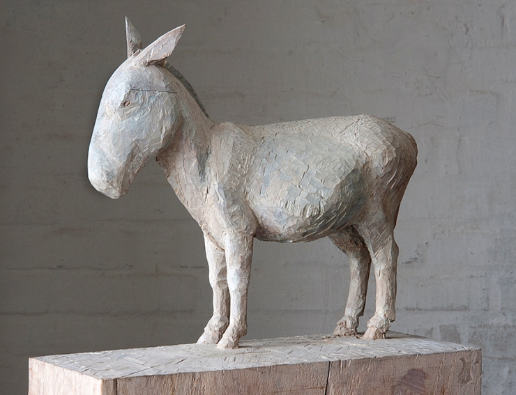 Esel, 2007, Holz, farbig gefasst, 50 × 39 x18 cm / Karnickel, 2007, Steinguss,1/3, Guss: Kristof Grunert