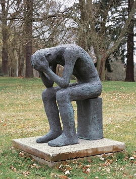 Skulpturen. Der Hockende aus dem Jahre 2015 ist in einen Würfel